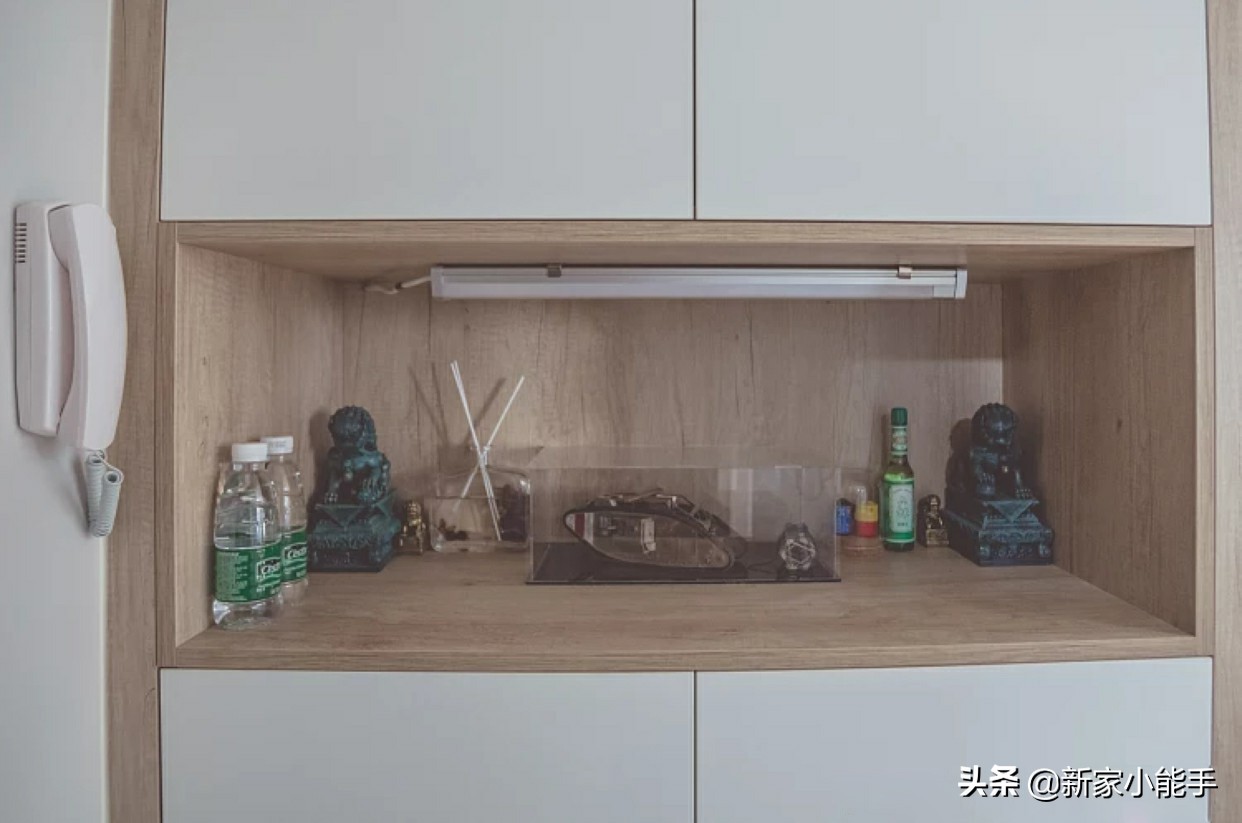 墙上安装了一块木板,还可以挂一些平时排水的照明或者出门旅游买回来的纪念品,挂在上面。下面位置放着一个白色置物架,平时吃的零食等,都有序收纳起来。紧凑型的房子只能这样子利用起来了。