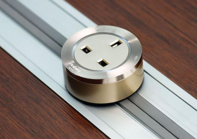 轨道插座,是用一根长度可定制的轨道,内置插座导轨,根据需要设置一排插座,并且可随意在轨道上移动,解决了传统插座的许多缺点。