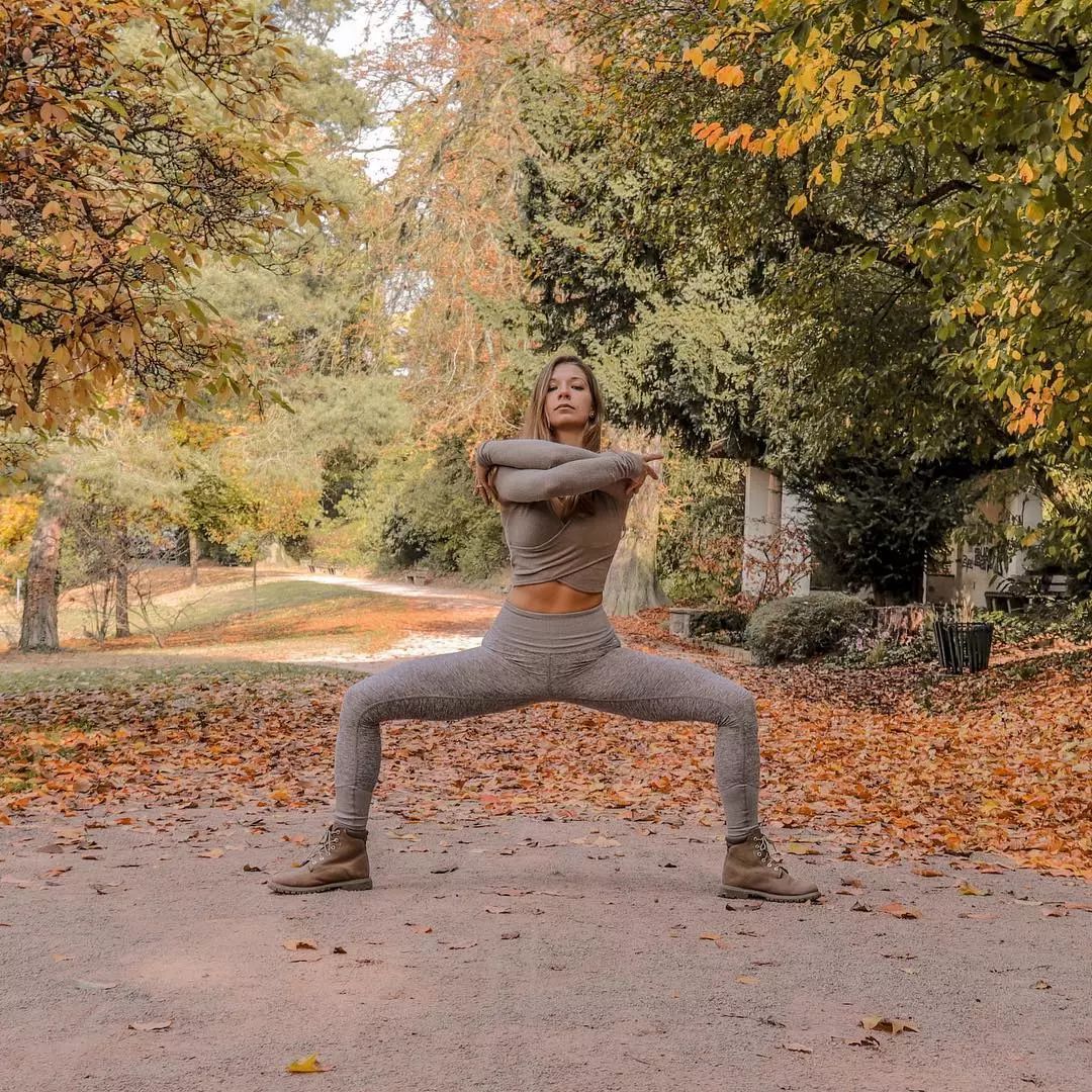锻炼腿部,帮助塑造腿部,拒绝肌肉质量仍然是一项运动,总是有细长的长腿,快快跟我走,分开两条腿来回弯曲前腿的膝盖并直接踩在地面,使小腿垂直于地面,收紧后腿以支撑身体,保持上半身笔直,一只手臂放在膝盖上,另一只手臂在空中伸展。