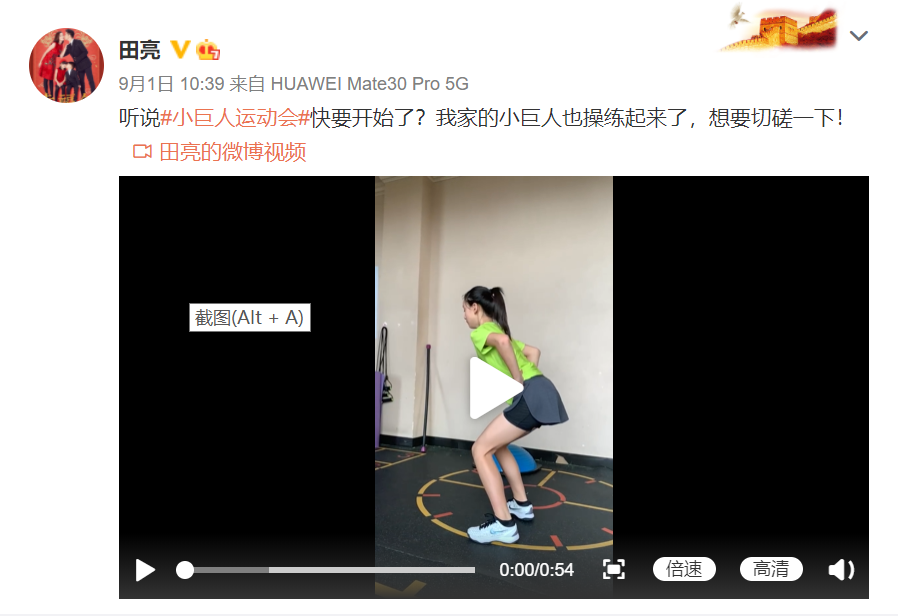 近日,中国男子跳水运动员田亮在微博社交平台上晒出一段女儿森碟的健身视频,并配文:“听说‘小巨人运动会’快要开始了?我家的小巨人也操练起来了,想要切磋一下!”