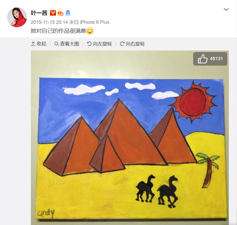 妈妈叶一茜有时也会在微博晒出森碟的画作,画作颜色也涂得均匀整齐,画工精细,完全超出了森碟这个年龄的水平,引来网友怒赞。